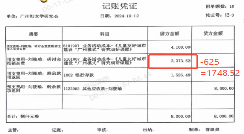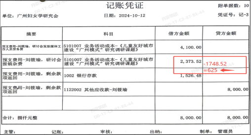 备注:该凭证只取打印费 625元, 1748.52元为1.2.10 工作餐交通费金额,(1748.52+625=2373.52)。媒体劳务费 3300元为1.7媒体劳务费,800元为1.8工作人员费,(3300+800=4100)
