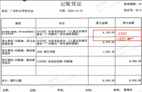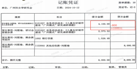 备注:该凭证只取媒体劳务费3300元,800元为1.8.3工作人员费,(3300+800=4100),1748.52元为1.2.10工作餐交通费金额,625元为1.10.2打印费(1748.52+625=2373.52