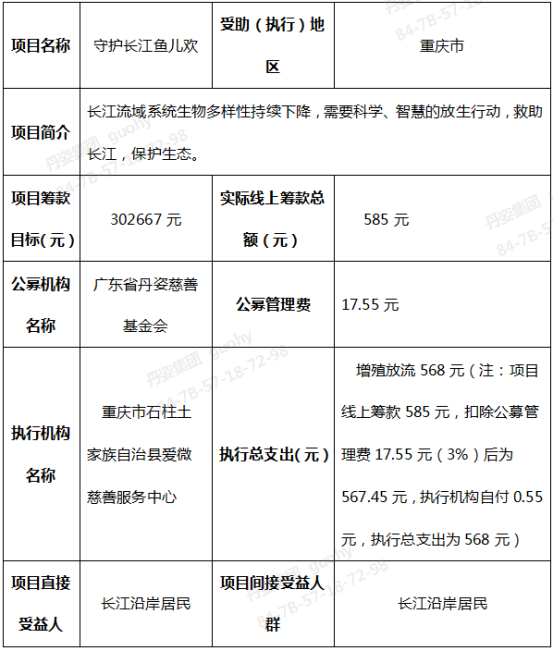 筹款目标:302667元。项目目标:生态效益:放流适合长江生态生存,不会破坏长江生态系的鱼类,可以滤食水中的藻类和浮游生物,净化和改善水质。通过增殖放流补充和恢复生物资源的群体,改善生物的种群结构,维护生物的多样性。改善水域的生态环境。