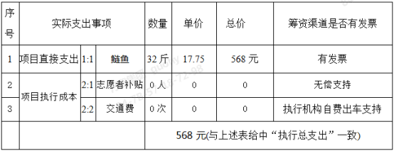 因为项目筹款效果不佳,采购鱼苗(鲢鱼适合长江生态生存,不会破坏长江生态系)太少,执行机构没有大规模开展增殖放流活动,没有向当地渔政部门报备,鱼苗采购有检疫证明。
